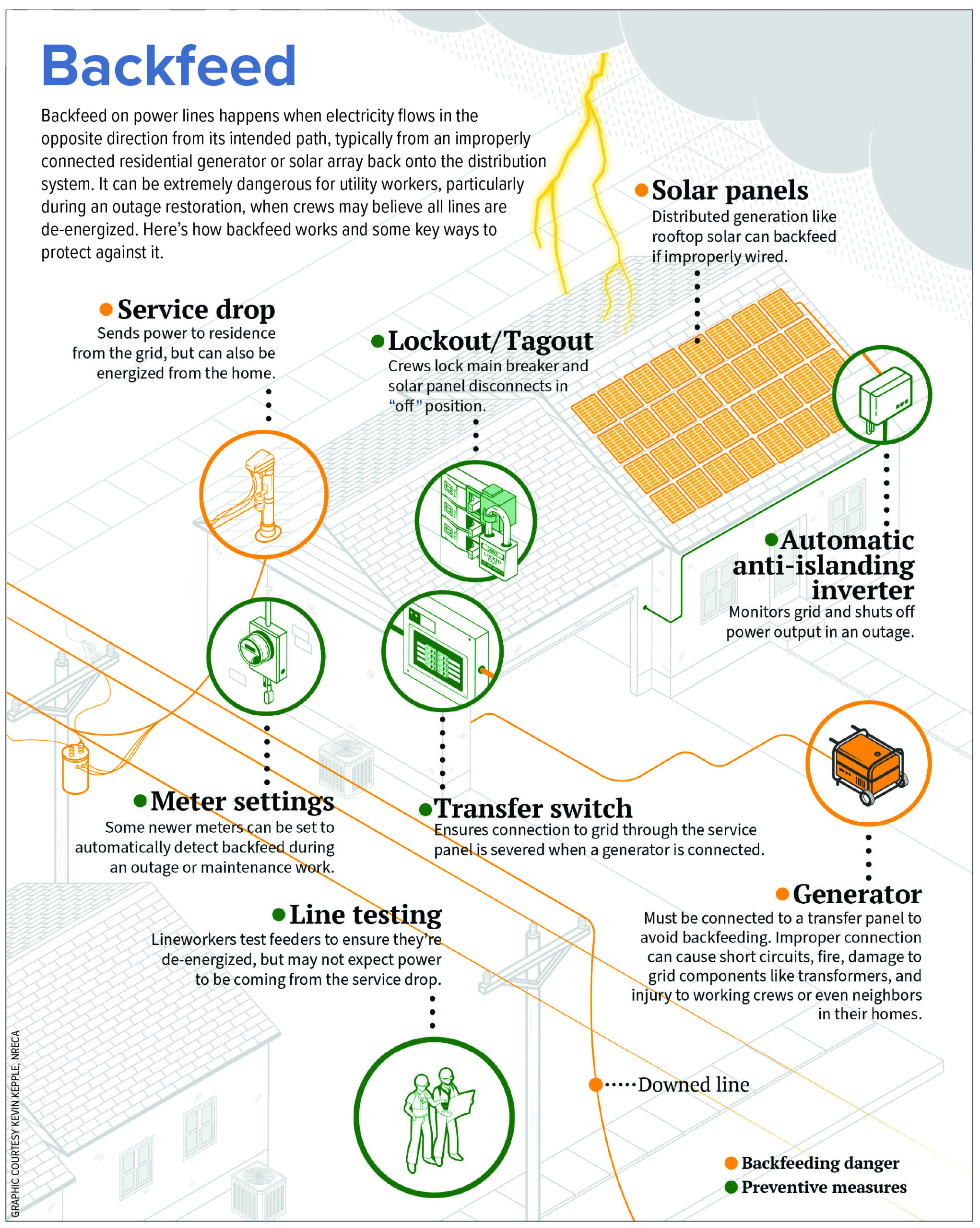 Consumer interest in alternative power sources to homes and businesses — and to restore power more quickly after storms or accidents — has introduced new safety risks for lineworkers and homeowners. One of the most serious hazards associated with solar panels, generators and battery backup systems is backfeed.